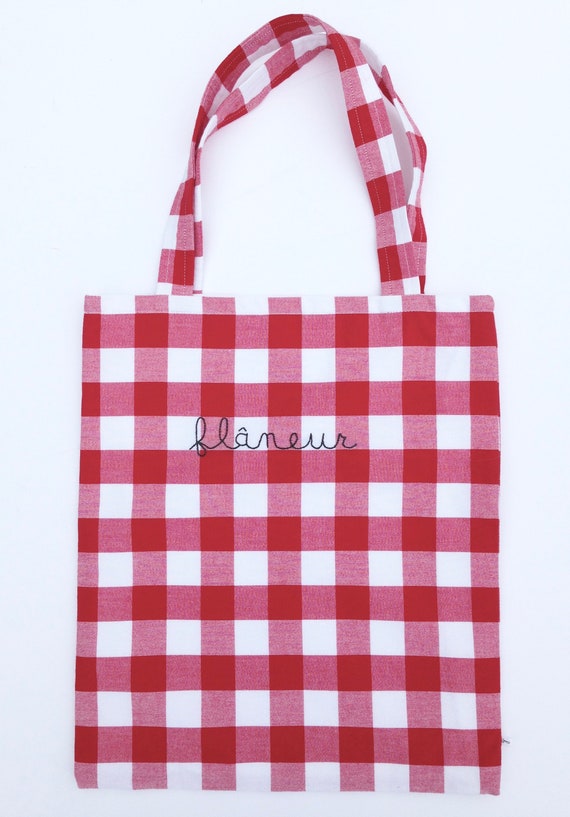 Gingham Tote Bag Francophile Tote Travel Gift Idea Study Abroad Gift Teen Girl Tote Embroidered Book Bag Flaneur Bag Library Tote Bag