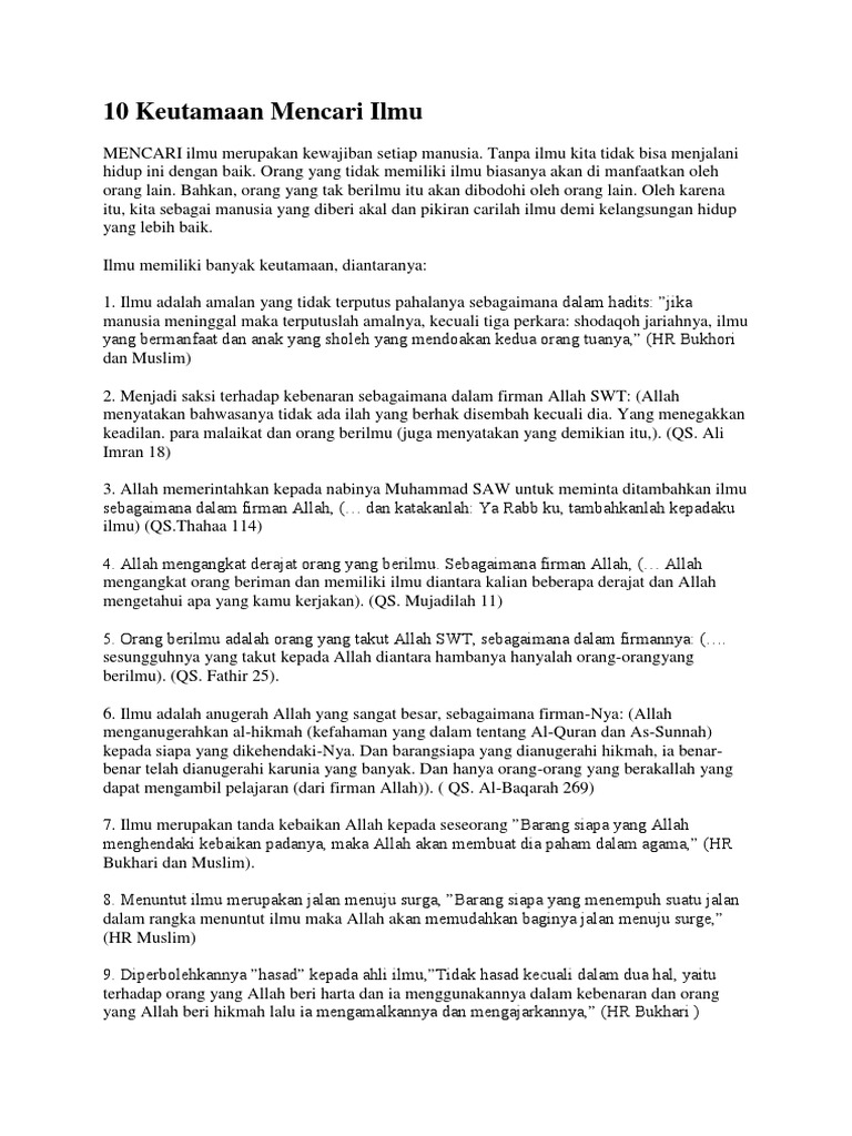 Menuntut ilmu merupakan hal yang wajib dilakukan oleh kita sebagai umat manusia. Hadits yang mulia ini menunjukkan agungnya kedudukan ilmu agama dan keutamaan yang besar bagi orang yang mempelajarinya sehingga imam an nawawi dalam kitabnya riyadhush shalihin pada pembahasan keutamaan ilmu mencantumkan hadits ini sebagai hadits yang pertama. Keutamaan keutamaan ilmu dan pemilik ilmu hal yang disayangkan ternyata beberapa majelis ilmu sudah tidak memiliki daya magnet yang bisa memikat umat islam untuk duduk di sana bersimpuh di hadapan allah untuk meluangkan waktu mengkaji firman firman allah azza wa jalla dan hadist nabi shallallahu alaihi wa sallam.