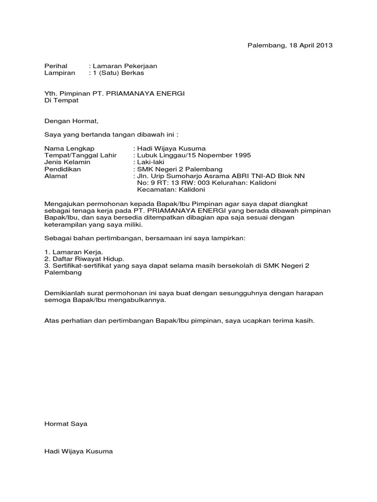 .lamaran pekerjaan kepada kepala sub bidang kepegawaian dinas perhubungan kota dengan hormat, saya yang bertanda tangan di bawah ini: Pt atau perseroan terbatas, ataupun perusahaan sekarang ini menjadi tempat favorit sebagian orang untuk mengadu pekerjaan. Kesimpulan dan pentingnya surat lamaran kerja di bank. Contoh surat lamaran kerja yang baik dan benar. Surat lamaran kerja adalah suatu dokumen resmi yang harus kita buat jika ingin melamar suatu pekerjaan, baik itu di pabrik, di toko, di kantor, di bank, maupun di hotel.